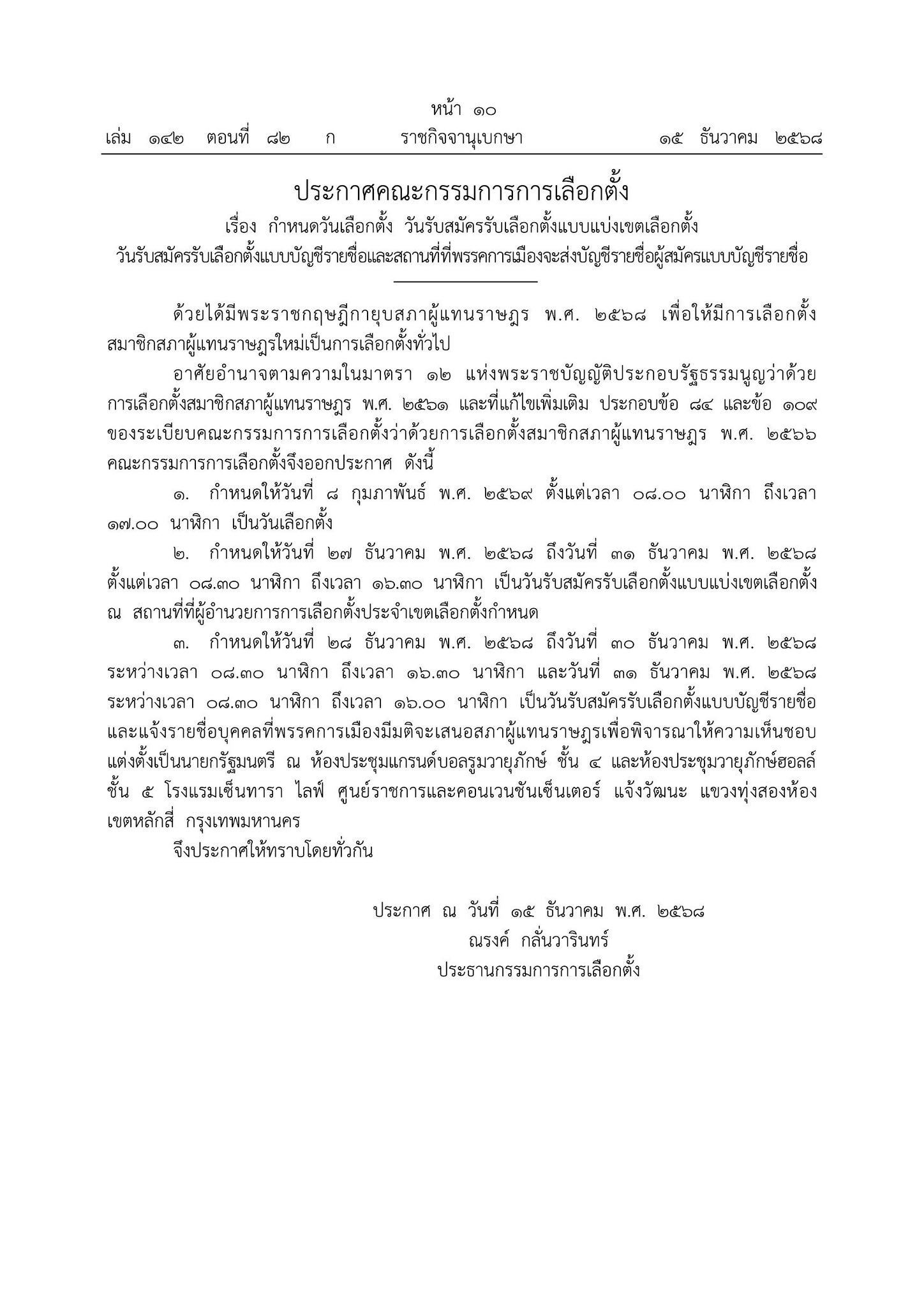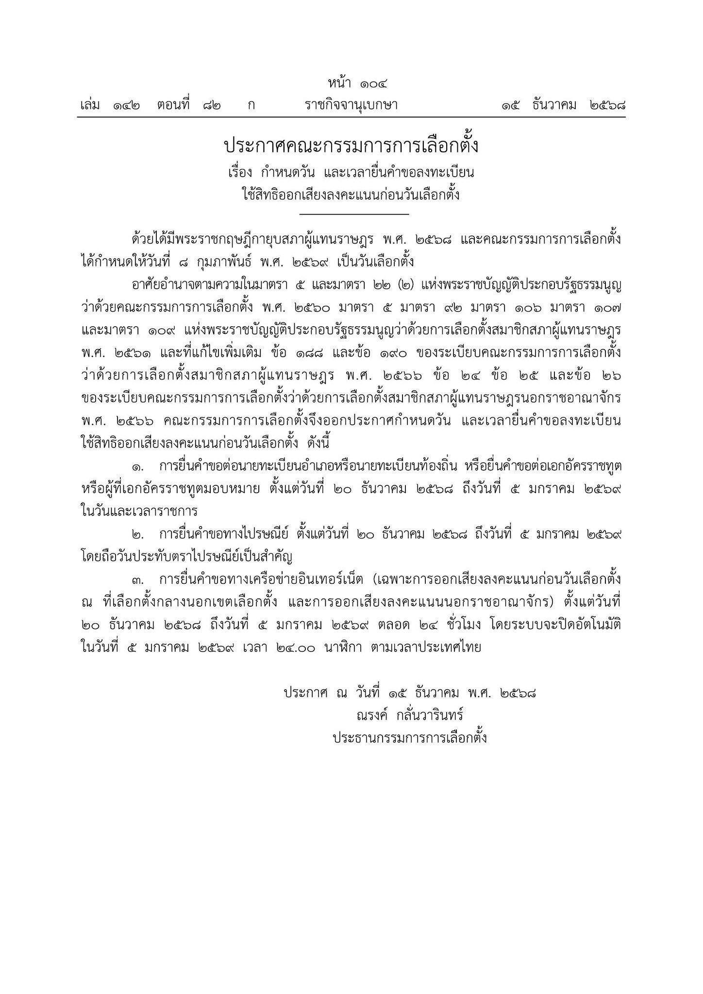 ตามที่ได้มีพระราชกฤษฎีกายุบสภาผู้แทนราษฎร พ.ศ. 2568 และต่อมาคณะกรรมการการเลือกตั้งได้มีประกาศกำหนดวันเลือกตั้งสมาชิกสภาผู้แทนราษฎร เป็นวันที่ 8 กุมภาพันธ์ 2569 นั้น