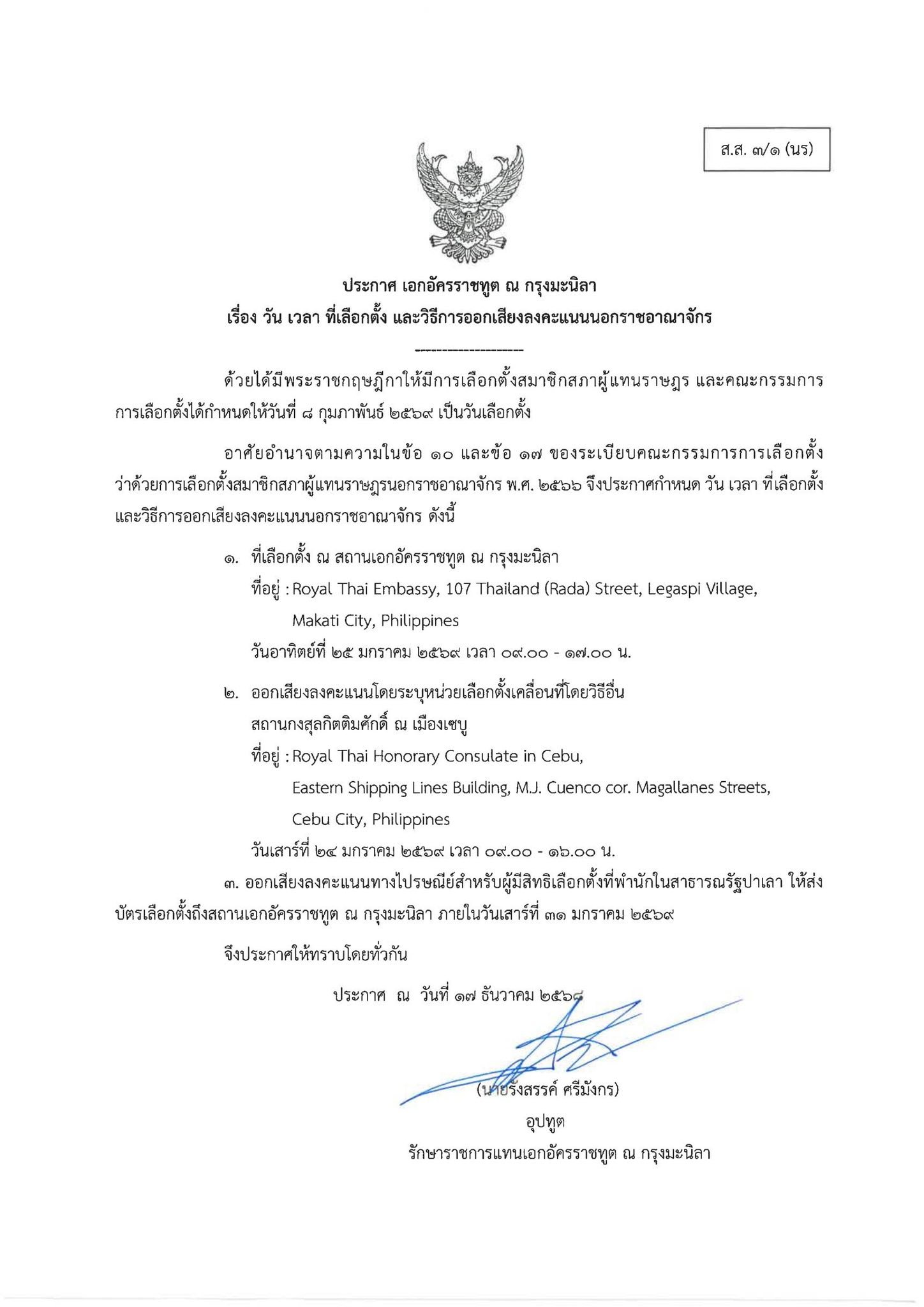 สถานเอกอัครราชทูต ณ กรุงมะนิลา ได้ออกประกาศเอกอัครราชทูต ณ กรุงมะนิลา เรื่อง วัน เวลา ที่เลือกตั้ง และวิธีการออกเสียงลงคะแนนนอกราชอาณาจักร สำหรับผู้มีสิทธิเลือกตั้งใน สาธารณรัฐฟิลิปปินส์ และ สาธารณรัฐปาเลา ดังนี้