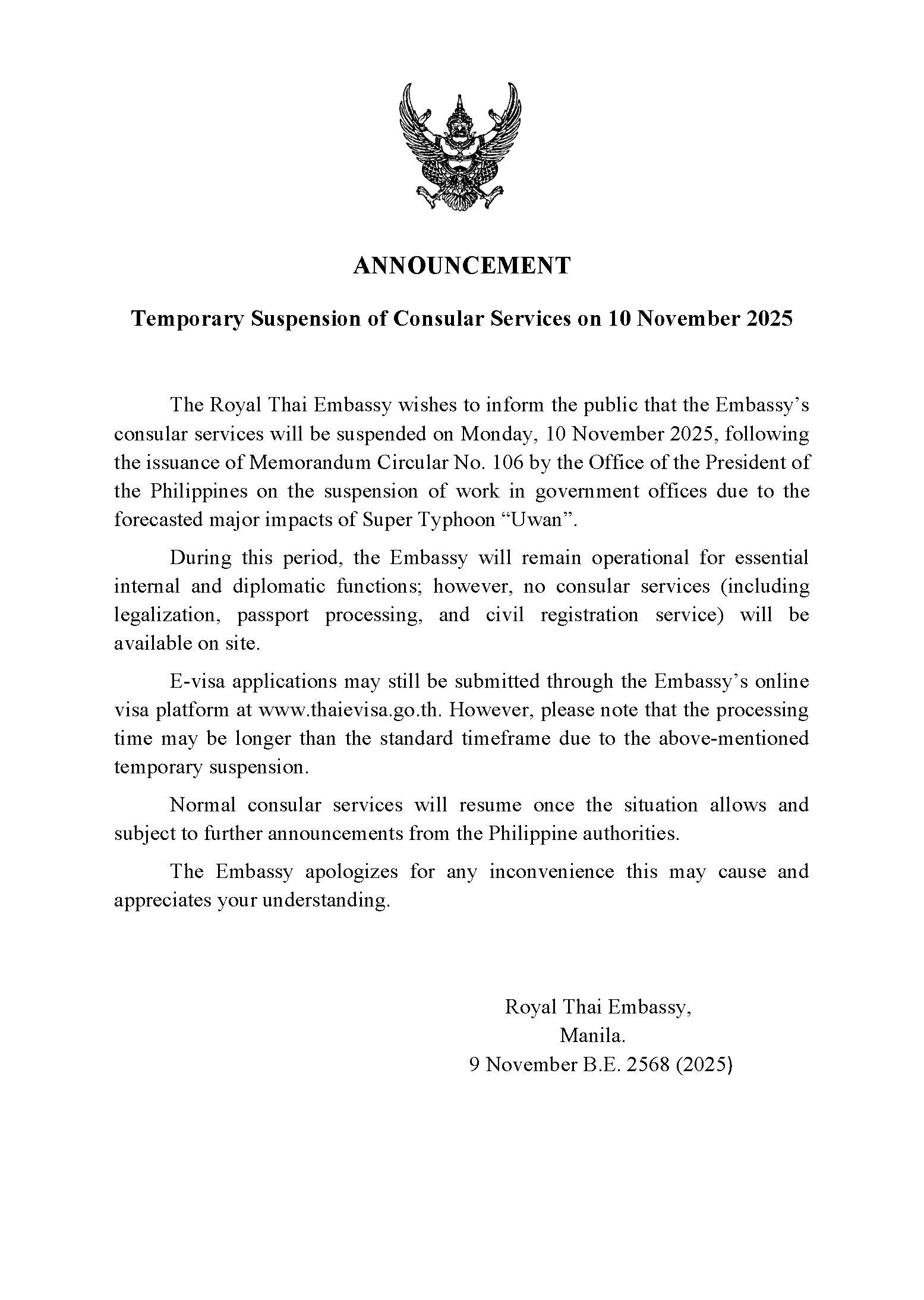 The Royal Thai Embassy in Manila wishes to inform the public that the Embassy’s consular services will be suspended on Monday, 10 November 2025, following the issuance of Memorandum Circular No. 106 by the Office of the President of the Philippines on the suspension of work in government offices due to the forecasted major impacts of Super Typhoon “Uwan”.