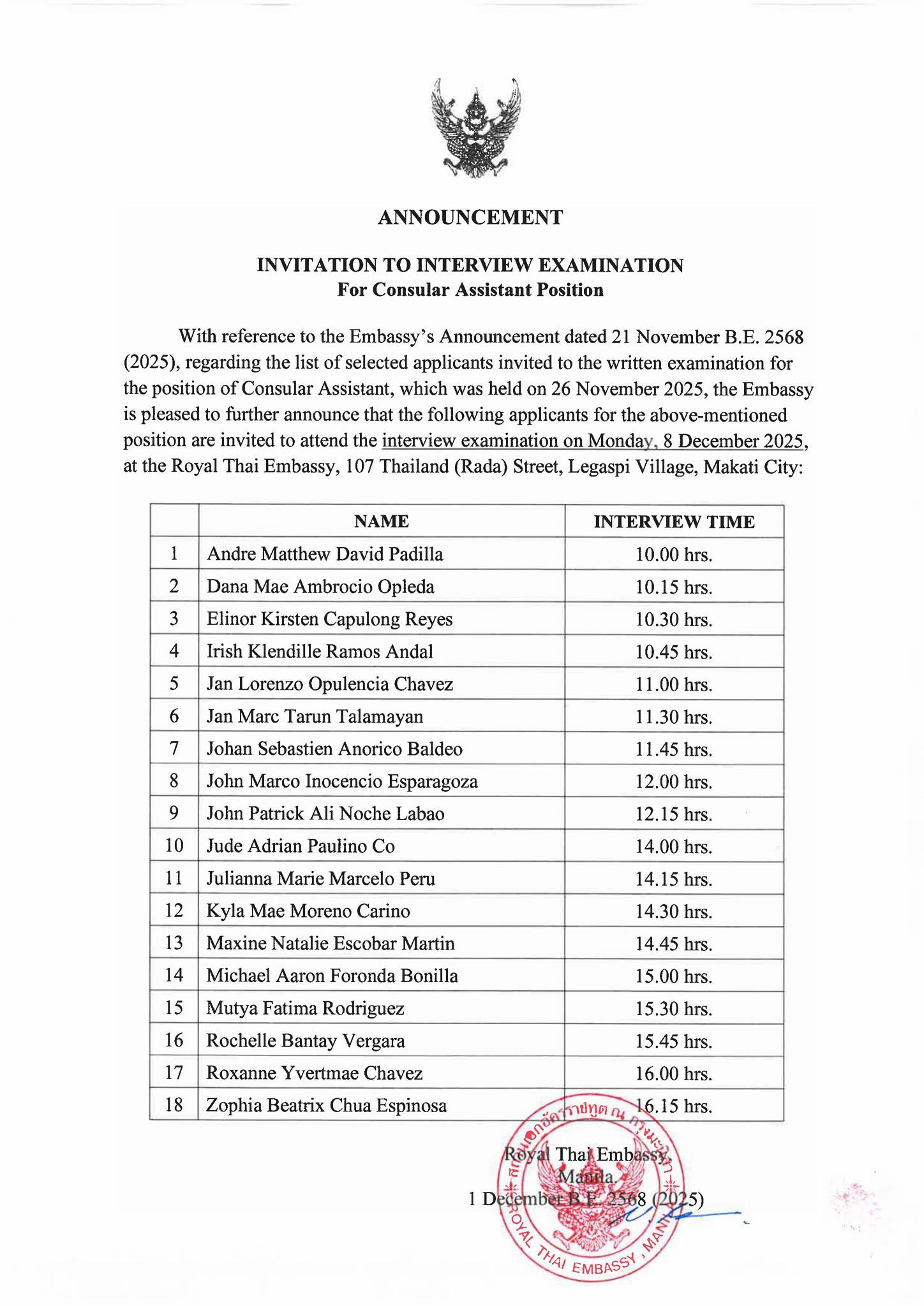 With reference to the Royal Thai Embassy's Announcement dated 21 November B.E. 2568 (2025), regarding the list of selected applicants invited to the written examination for the position of Consular Assistant, which was held on 26 November 2025, the Embassy is pleased to further announce that the following applicants for the above-mentioned position are invited to attend the interview examination on Monday, 8 December 2025 at the Royal Thai Embassy, 107 Thailand (Rada) Street, Legaspi Village, Makati City.