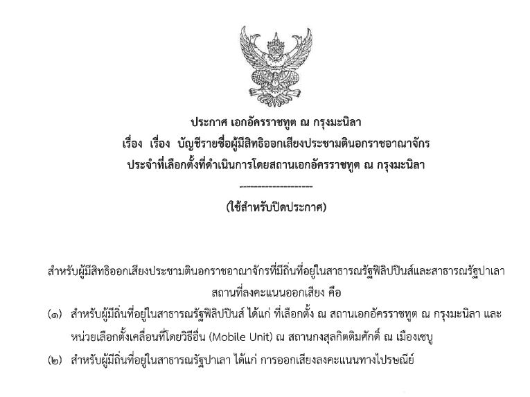 สำหรับผู้มีสิทธิออกเสียงประชามตินอกราชอาณาจักรที่มีถิ่นที่อยู่ในสาธารณรัฐฟิลิปปินส์และสาธารณรัฐปาเลา สถานที่ลงคะแนนออกเสียง คือ (๑) สำหรับผู้มีถิ่นที่อยู่ในสาธารณรัฐฟิลิปปินส์ ได้แก่ ที่เลือกตั้ง ณ สถานเอกอัครราชทูต ณ กรุงมะนิลา และ หน่วยเลือกตั้งเคลื่อนที่โดยวิธีอื่น (Mobile Unit) ณ สถานกงสุลกิตติมศักดิ์ ณ เมืองเซบู (๒) สำหรับผู้มีถิ่นที่อยู่ในสาธารณรัฐปาเลา ได้แก่ การออกเสียงลงคะแนนทางไปรษณีย์ คลิกเพื่อดูรายชื่อ