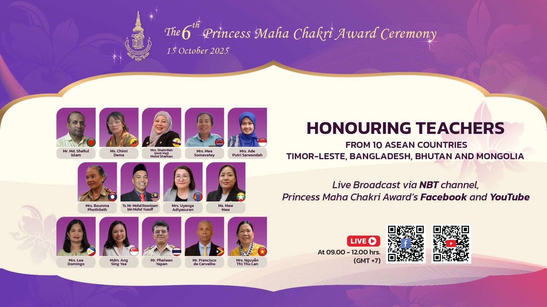 On 15 October 2025, Her Royal Highness Princess Maha Chakri Sirindhorn graciously presided over the Awarding Ceremony of the 6th Princess Maha Chakri Award (PMCA) at IMPACT Arena, Exhibition and Convention Center, Muang Thong Thani, Nonthaburi, Thailand.