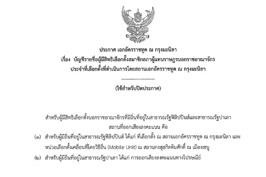 สถานเอกอัครราชทูต ณ กรุงมะนิลา ได้ออกประกาศเอกอัครราชทูต ณ กรุงมะนิลา เรื่อง วัน เวลา ที่เลือกตั้ง และวิธีการออกเสียงลงคะแนนนอกราชอาณาจักร สำหรับผู้มีสิทธิเลือกตั้งใน สาธารณรัฐฟิลิปปินส์ และ สาธารณรัฐปาเลา ดังนี้